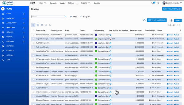 Módulo central de la plataforma para registro de Clientes, contactos, relaciones, generación de leads, definiciones de pipeline, gestión de transacciones por Cliente, definición de métodos de cobro y resumen de la salud del Cliente y sus suscripciones.